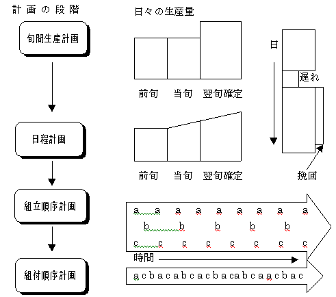 旬間計画により10日単位で与えられた車型別の生産台数を、車種ごとでも、車型ごとでも、ユニットの種類ごとでも、特殊な仕様ごとでも、毎日の生産台数がてきる限り均等になるように作成する。