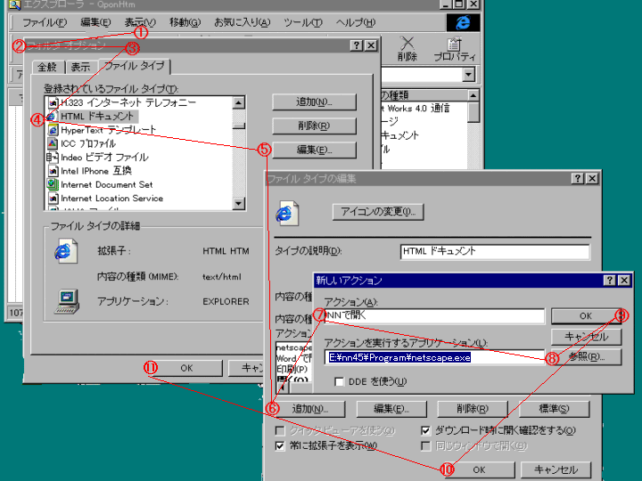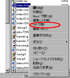 ホームページを作成する時留意しなければならない事の1つに インターネットエクスプローラとネットスケープナビゲーター の双方で上手く表示されるか確認することがある。 そのため2つのブラウザをインストールしている人が多いが、 この確認作業が結構面倒なものである。 エクスプローラーで目的のhtmlファイルをダブルクリックすれば 通常使うブラウザの方はすぐ立ち上がり確認出来るが、 もう一方のブラウザの方は 「ブラウザのアイコンをクリック」、立ち上がるまで待機し、 「ファイル」「ページを開く」「ファイルの選択」 「ディレクトリー階層を辿ってファイル名を探し」「開く」「開く」 と何度もマウス操作をしなければならない。 ところが「ファイルタイプの関連付け」をしておけば以降 「目的のファイルを右クリック」「NNで開く」を左クリック、 これだけで起動できる。 通常使うブラウザよりマウス操作が一回多いだけになる。 | ファイルタイプの関連付けのやり方 | |