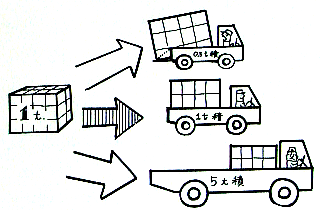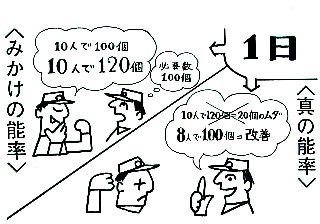 この場合は2人増員したかもしれないところを、改善によって人数はふやさずに生産台数を上げ得たので、もうけにつながる改善である。 では、生産計画が100個/日で変わらなかったり、あるいは減産で90個/日になった場合はどうなるだろう。このときも能率が上がるからといって、毎日120個/日ずつ造ったとしたら、製品は1日に20〜30個ずつ余ってしまう。これは材料費、労務費の先食いだけでなく、この在庫を管理するためにパレットや置場所や工数がふえ、会社としてはかえってマイナスになってしまう。このままでは業績に寄与しない改善、むしろ”改悪”である。 この例のように、必要数が変わらなかったり減った場合でも、もうけにつながる能率向上をするにはどうすればよいのだろうか。 この場合は、100個/日を8人で(必要数90個/日なら90個/日を7人で)造るように、工程を改善しなければならない。これなら能率も向上し原価も低減する。 このように、同じ能率向上といっても、10人で120個/日造るやり方と、8人で100個/日造るやり方と2とおりある。どちらも2割前後の能率向上であるが、どちらのやり方をとるかは、生産台数(必要数)がいくらかということによって決められる。すなわち、生産台数が大前提であることを忘れてはいけない。 ところが、計算の上では似たような結果となるこの2とおりのやり方も実際にラインで実行する場合は大きな違いがある。台数をふやして能率を上けるやり方は、比較的容易で大部分の監督者はやれるが人を減らして能率を上げるやり方はこれの数倍難しい。だから、どうしても能率向上というと、必要数を無視して前者のやり方をとる傾向が出てくる。 他社も含めていろいろな現場で、能率向上のかけ声の下に速いスピードで製品が造られ、ラインの後で在庫の山となっていることを見かけるが、これは必要数が前提だということを忘れているのと、もう一つは、量をふやして能率向上する方がやさしい、というところに原因があると思われる。 しかし、減産時にこういうやり方で能率向上をはかると、一方で売上げが減っているのに、他方で出費がふえることになり、最悪の場合、会社の命取りにもなりかねない(特に中小企業においては、こういうやり方の打撃は大さいものがある)。 このように、必要数が変わらなかったり、減産しているときに、量をふやして能率向上をはかるやり方を、トヨタ式生産システムにおいては、見かけの能率(すなわち、計算の上だけの能率アップ)と呼んで、やってはいけないこととしている。 いくら困難であろうとも、工数低減をして能率を向上させなければならないときは、それに挑戦しなけれはいけない。むしろ、このやり方ができるようになっておれば、増産期に能率を向上させるのは大変やさしいことである。この意味では、減産期こそ管理・監督者やスタッフは、力をつけるチャンスであるということが言えるだろう。 1−3 「生産量=必要数」が大前提 ここまで述べてくると、どうしても必要数というものについて考えざるを得ない。 前項で述べたように、能率向上には2つのやり方がある。一つは生産量を大さくすることであり、他の一つは人数を減らすことである。 現実のラインで、能率向上のためにどちらの方法をとっても良いということになれば、大部分のラインは生産量の増大をとるであろう。このやり方の方がめんどうでなく抵抗も少ないからである。 しかし、このやり方は月々生産量が増大しているか、以前から能力不足で残業に追われているラインには適しているが、それ以外には造りすぎのムダが発生し、原価アップにつながることは前にも述べたとおりである。 何度も言うが、目的はあくまでも原価低減にあるのだから、能率の向上もこれに合致した方法がとられなければならない。造りすぎによるムダを排除して原価低減するためには、生産量と必要数とがイコールでなけれはならない。 では、必要数は何から決まるか。それは売れゆきである。すなわち、市場の動向から決まってくる。したがって、現場にとっては与えられたものであり、勝手に数量を増減できないと考えなければいけない。 だから、生産現場でおこなうべき能率向上も必要数を前提として、この範囲の中で達成しなければならない。 能率をものさしとして用いる場合は、以上のような考え方が根底になければならない。これがきちんと整理されていれば、造りすぎのムダが発生することは防げる。そして、能率向上 = 原価低減ということになるのである。 なお、必要数が改善前と変わらないか、減った場合の改善のやり方について、もう少し具体的に見てみよう。 この場合、工数低減をはかって能率を向上するということは、必要数から算出された生産タクトの中で作業の中のムダを省いて、できるだけ多くの仕事(働き)をしてもらうか、あるいは、人の作業の一部を自働化して、その分を別の仕事をしてもらい、次にこれを集めて、より少ない