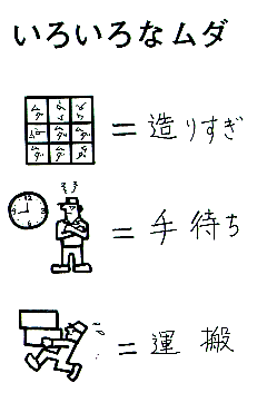 (1)造りすぎのムダ (2)手待ちのムダ (3)運搬のムダ (4)加工そのもののムダ 以下、一つ一つについて解説する。 3−2−1 造りすぎのムダ 余分なものを造りすぎるために起きるムダのことである。この造りすぎのムダは、普通の場合、仕事の進みすぎから発生する場合か多い。本来手待ちにならなければならない時間なのに、次の作業をやってしまう。たとえば、作業者と作業者との間、工程と工程とのつなぎなどで見られる積み上げたり積みおろす作業であり、これらはムダな労力を費やす原因を作っている。さらには、機械の増設・材料の先食い・作業者のムダな補充・金利負担や広い倉庫・運搬費など、造りすぎのムダは自工程だけにとどまらず、はかりしれない他のムダをも引き起こし、あたかも働いているかのように錯覚さえしてしまうのである。 造りすぎのムダの原因は、この他にもたくさんある。たとえば、(イ)作業に余裕を与えたり、手待ちがあった場合、この時間に必要以上の仕事が進んだとき、(ロ)機械(設備)の能力に