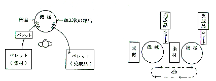運搬のムダを排除するためには、(イ)運搬距離を最短にする。(ロ)一時的な仮置きを無くすることが考えられる。一つの例をあげれば、従来は部品を大きなパレットから、小さなパレットへ移しかえ、さらに機械の上(旋盤のベッドの上)にと何度も仮置きをし、加工をおこなっていたが、パレットの改善をおこなうことにより、これらの仮置きを排除し(運搬のムダの排除)、一人の作業者が2台の機械を操作することができるようにしたのである。