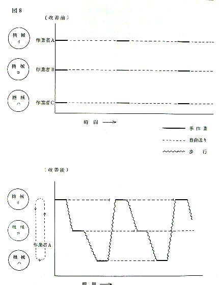 ゆとりがあるからといって、造りだめをしたとき、(ハ)SPH(時間当たり生産高)の向上だけを追求するあまり、全体の能率を無視した場合、(ニ) 高価な機械だから稼働率を上げないと償却できない、という間違った考えをしているときなどが考えられる。 3−2−2 手待ちのムダ 機械が自動的に加工しているときに、ただ立って機械の番人をしているとか、仕事をしたくても機械が回っていて、手が出せないために生ずるムダのことである。 たとえば、図4のように、改善前は(イ)、(ロ)、(ハ)の各機械に作業者がそれぞれついていた。このような工程だと機械が作業をしている間、作業者はただぼんやりと立っているだけで、作業をしたくてもできない。すなわち、手待ちのムダが発生しているわけである。