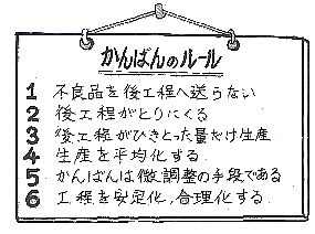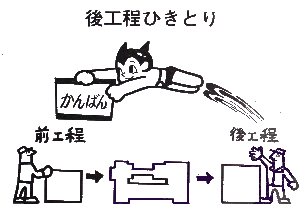 しかし、このような予想と現実のくい違いに、仕掛計画の変更が細かく、しかもタイムリーに対応できないのである。そこで、どうしたらうまく生産・納入指示ができるかということが、どこの生産現場でも問題となる。 そして、役に立たない情報がはんらんすることになり、居候が現場にゴロゴロ現れるということになってしまうのである。 ここで、「後工程に供給する」という考え方をかえて、必要な時期に、必要な量だけ、後工程が前工程にとりにくる、簡単に言えば、「後工程ひきとり」ということにしたらどうだろうか。 最終工程である車両組立から、最初の工程である材料出庫までのすべての工程が、かならず、必要な時期に、必要な量だけひきとるということにすれば、どの工程も、後工程へ供給しなければならない時期と量についての情報を、何も他から得る必要ななくなってしまう。 「供給」という考え方を、「ひきとり」という考え方に逆転することによって、一挙に難問解決の方法を見つけだすことができるわけである。 ここから「後工程がとりにくる」という第2のルールが固まる。そこで、後工程が勝手に気のむくままにとりにこないように、ルールを具体化することが必要になる。 「かんばんなしにとりにきてはいけない」 「かんばんの枚数以上にひきとってはいけない」 「現物には、かならずかんばんをつける」 というようなかんばんを運用する場合の大原則は、この第2のルールを後工程が間違いなく守るために必要なことなのである。 |
